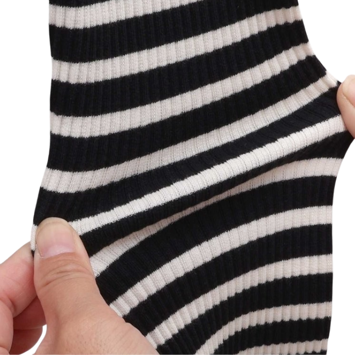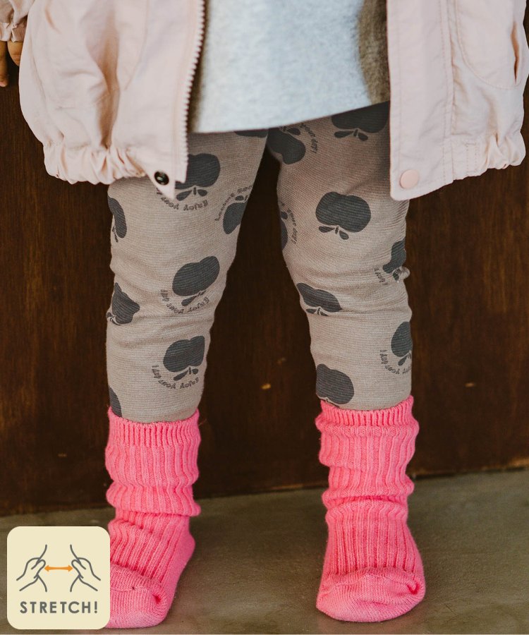 リブ素材のシンプルな合わせやすいタイプ、太目と細目のボーダー柄、格子柄、アルファベット柄、リンゴ柄の楽しい柄タイプ、全11種類をラインナップしています。