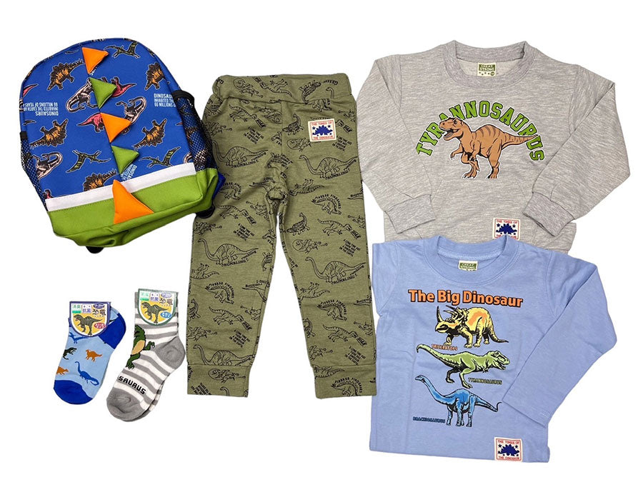 This set for boys includes a sweatshirt, long-sleeved T-shirt, long pants, and socks in a backpack.