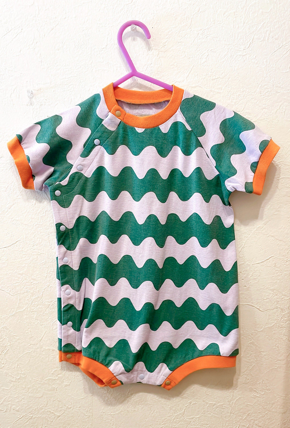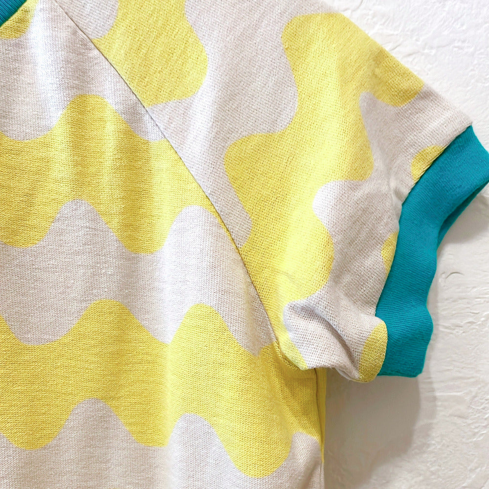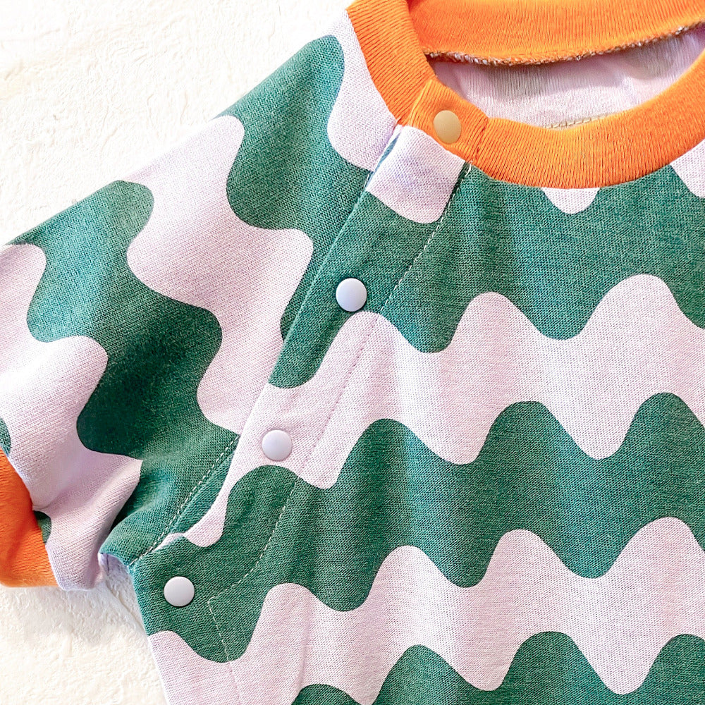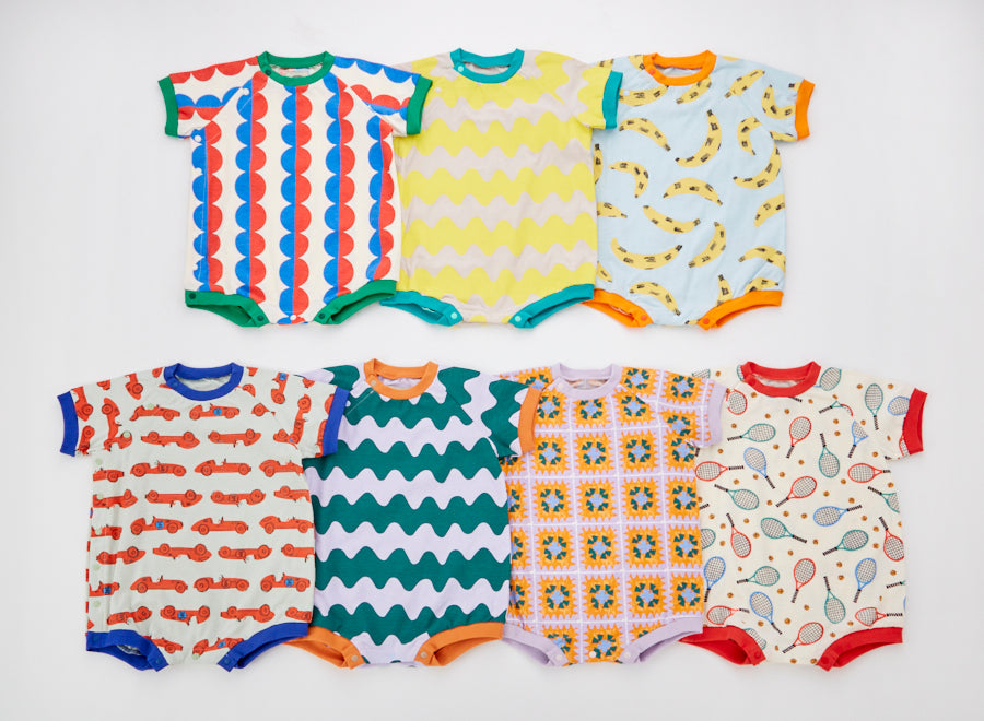 A cute, large, colorful all-over print romper. The ribbed color scheme is the highlight. A relaxed, wide silhouette.