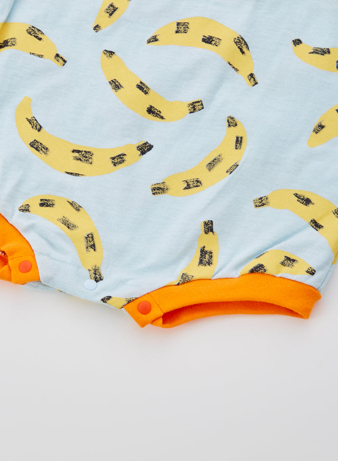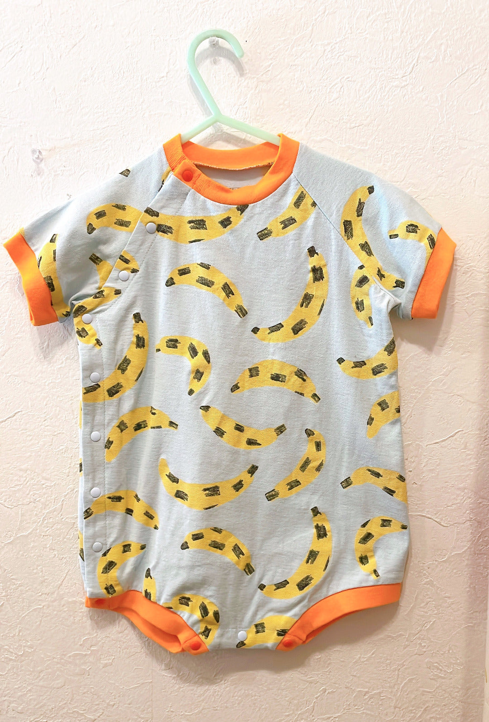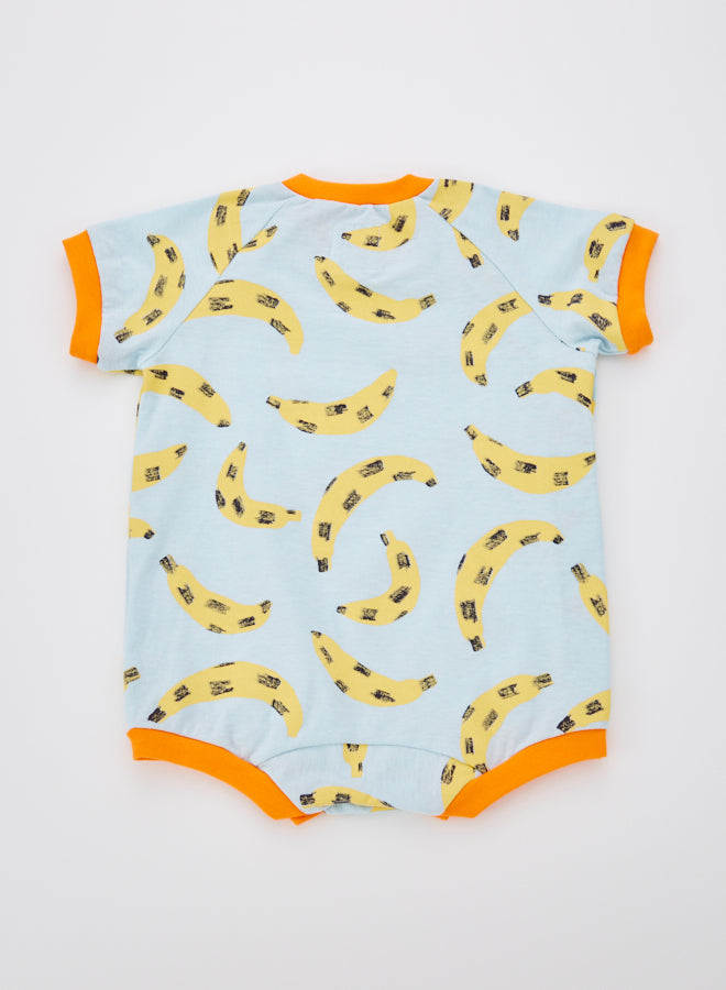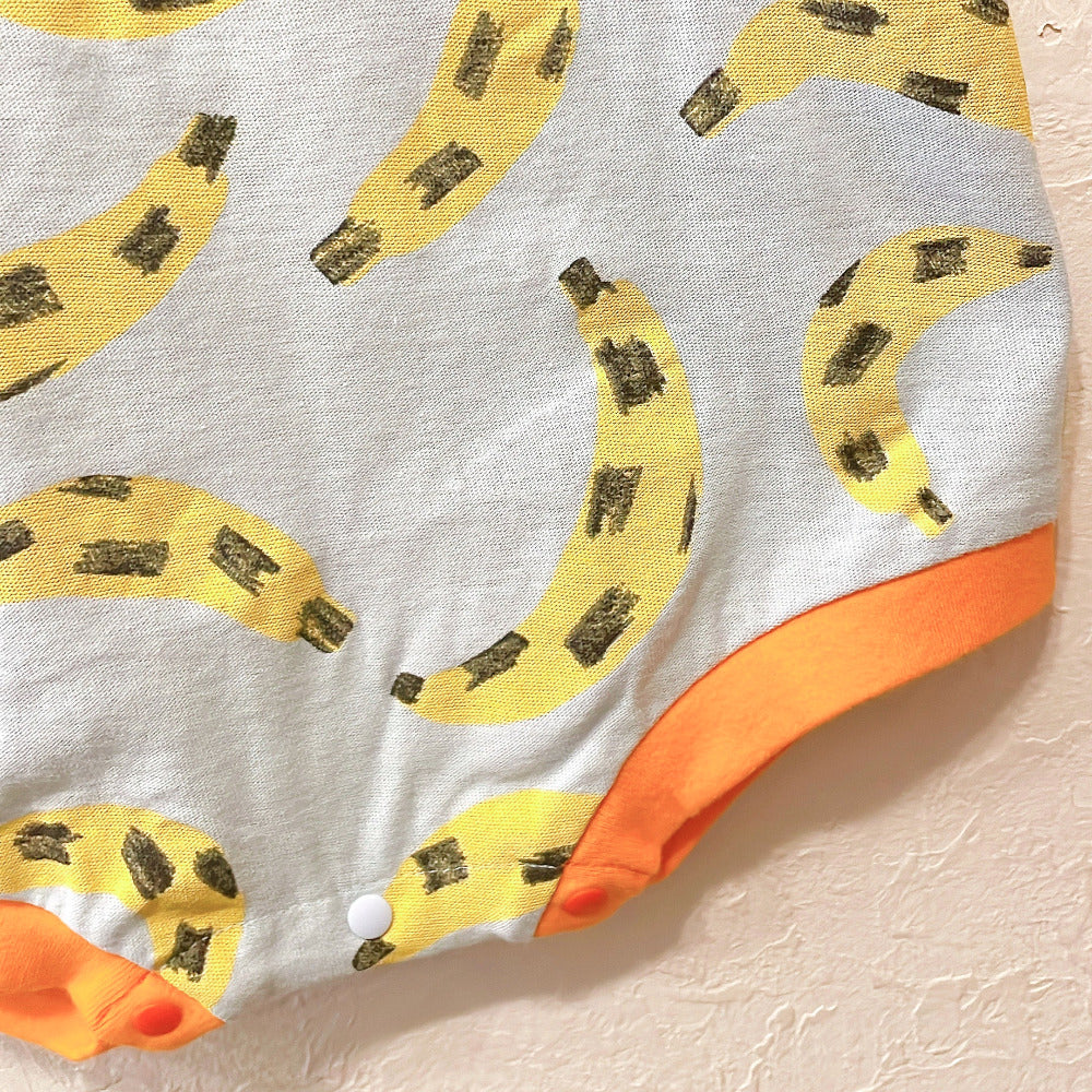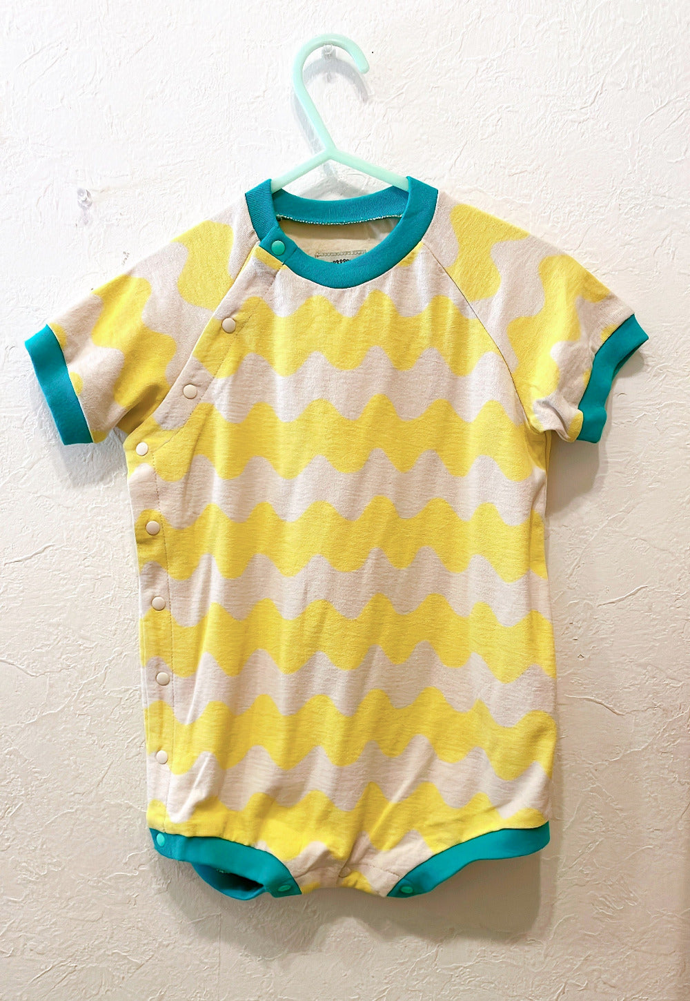 A cute, large, colorful all-over print romper. The ribbed color scheme is the highlight. A relaxed, wide silhouette.