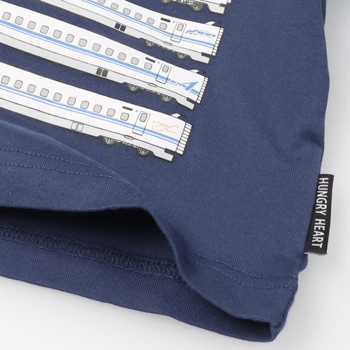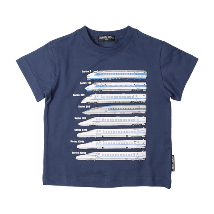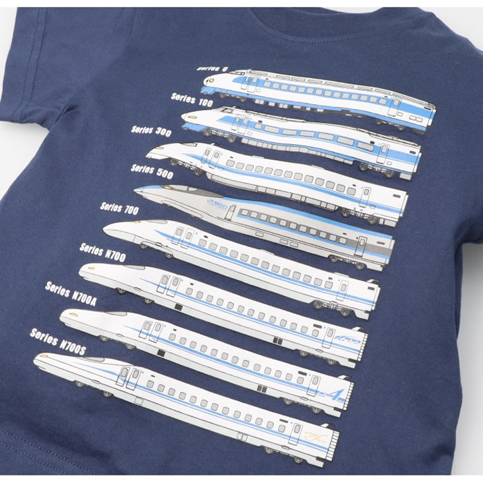 A short-sleeved T-shirt printed with various Shinkansen trains from the past.