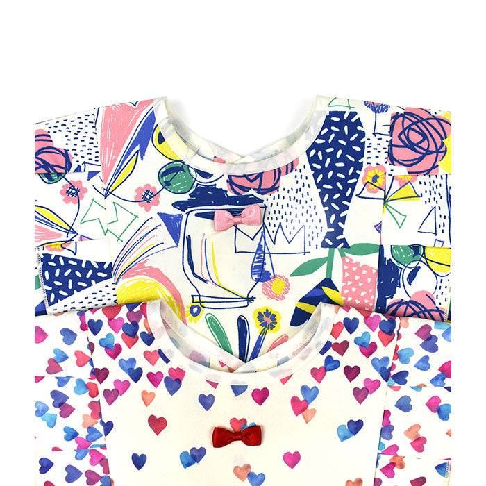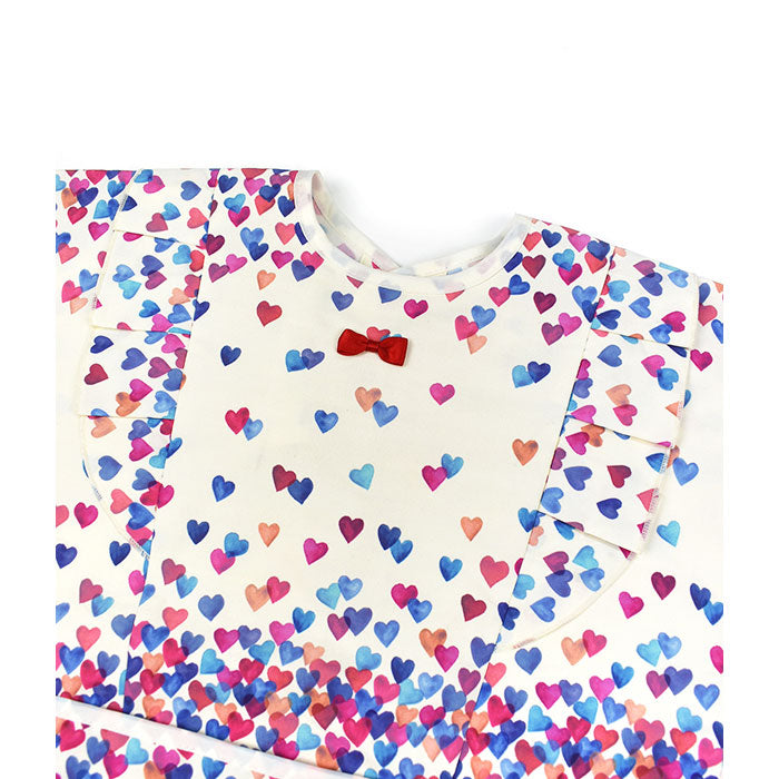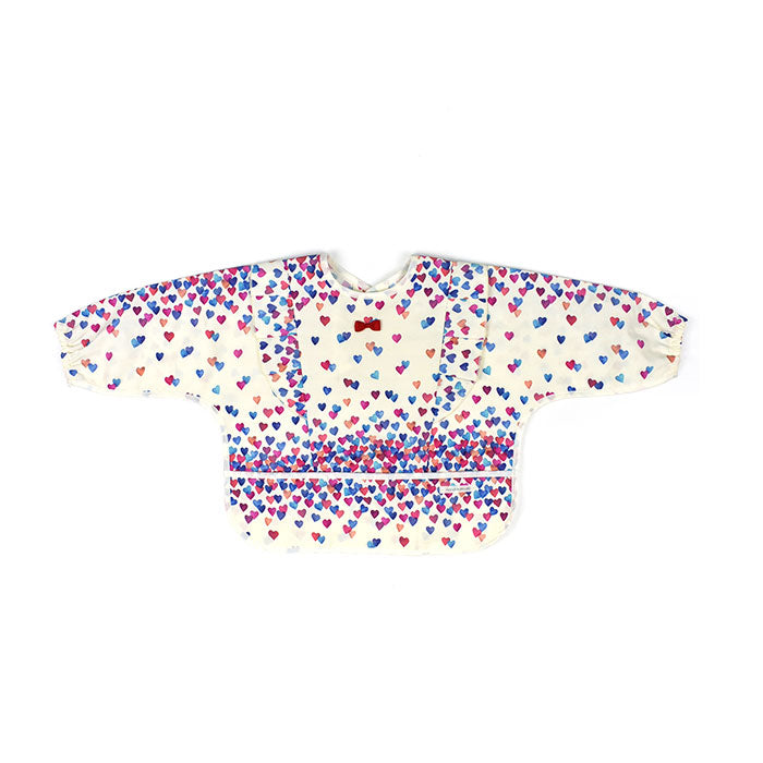 A girl's mealtime apron with full sleeves and an original all-over print, featuring ruffles and ribbons.
