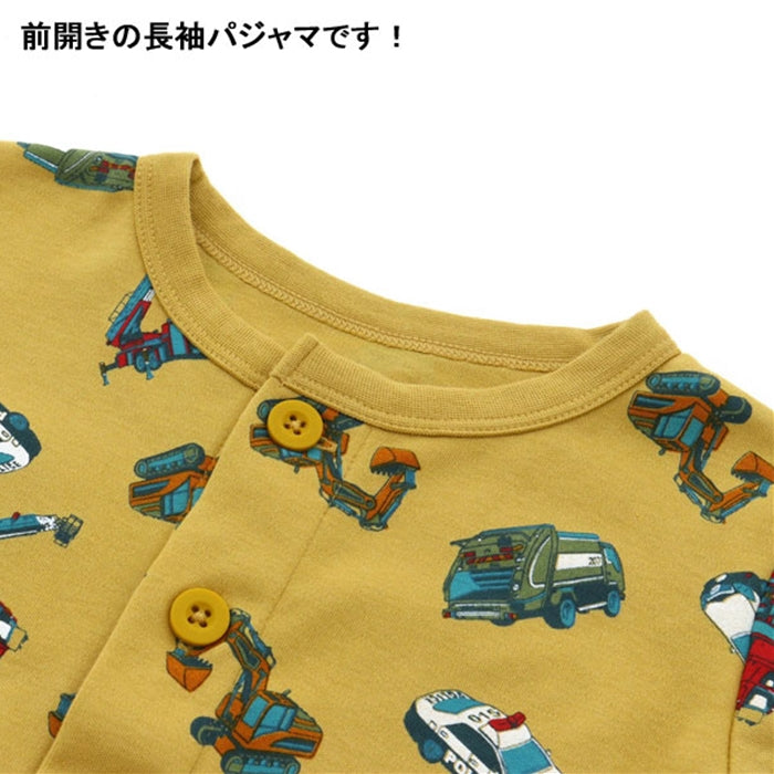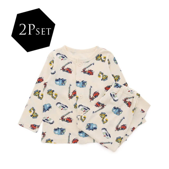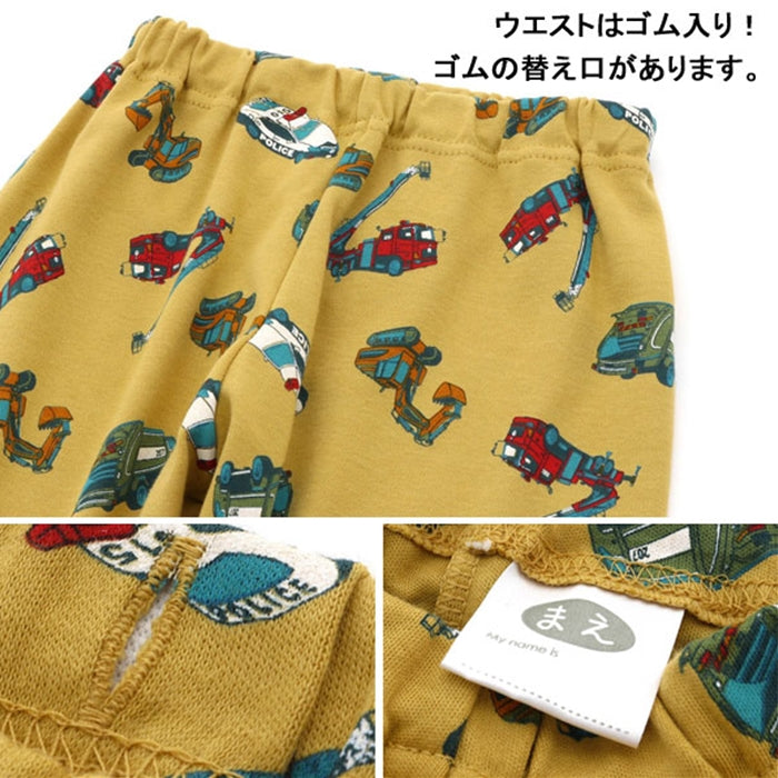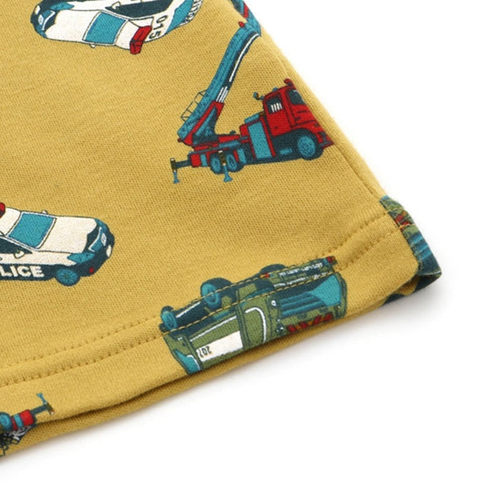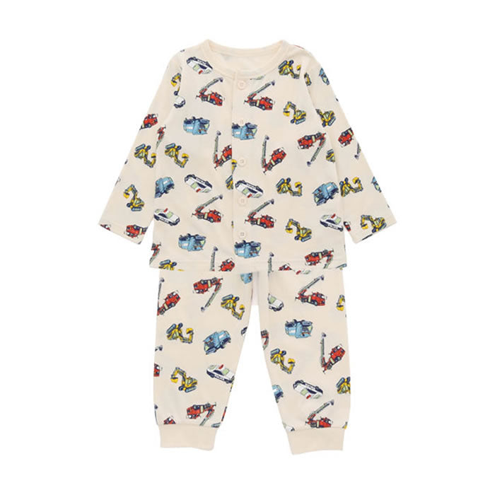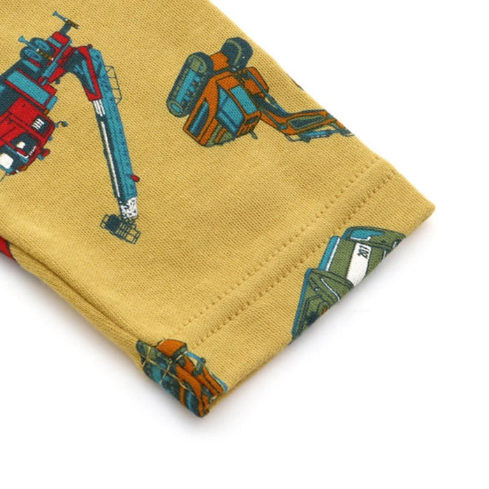 A cute long-sleeved long-pants shirt with a large overall pattern of police cars, excavators, ladder trucks, and compactors.