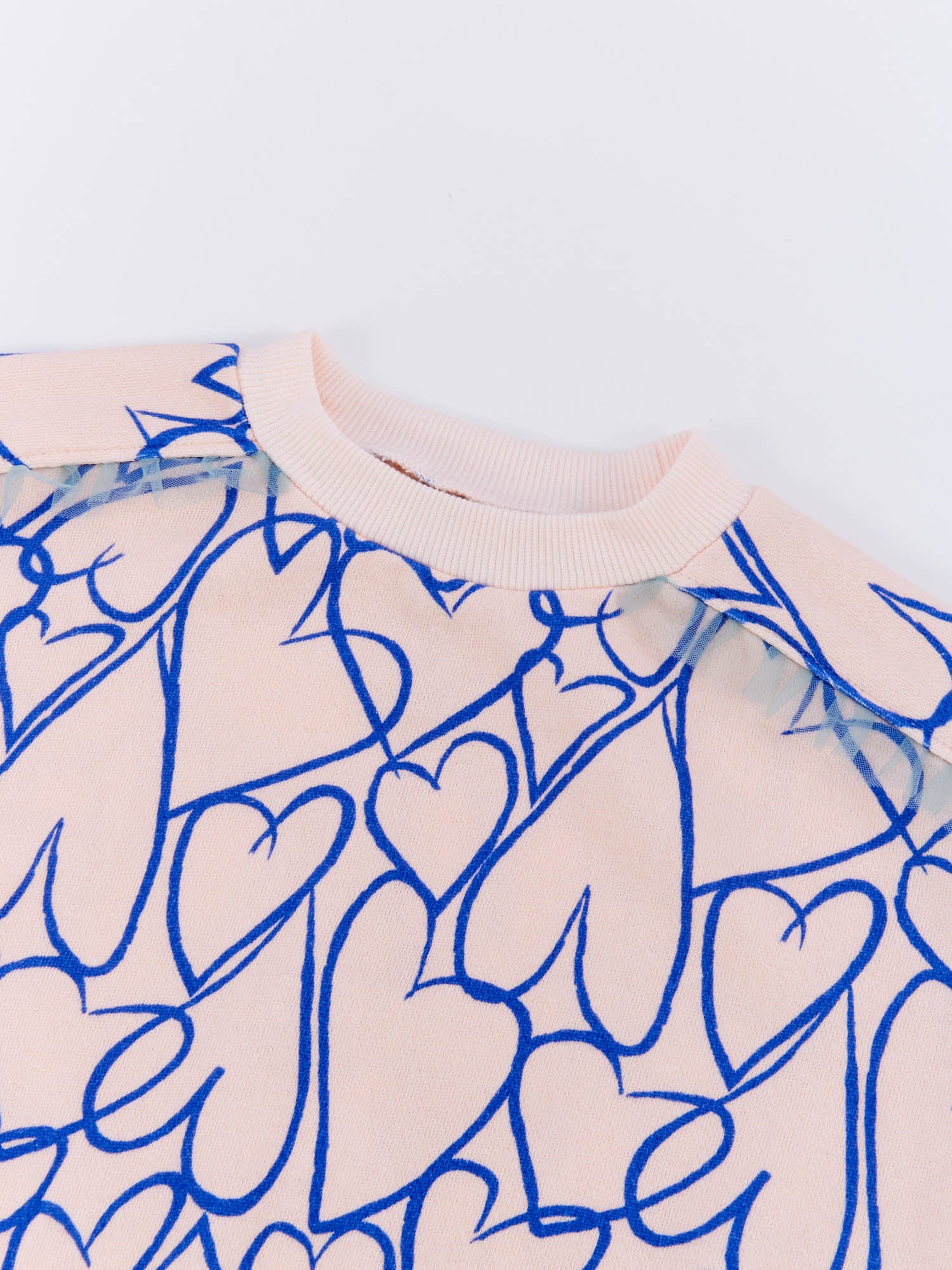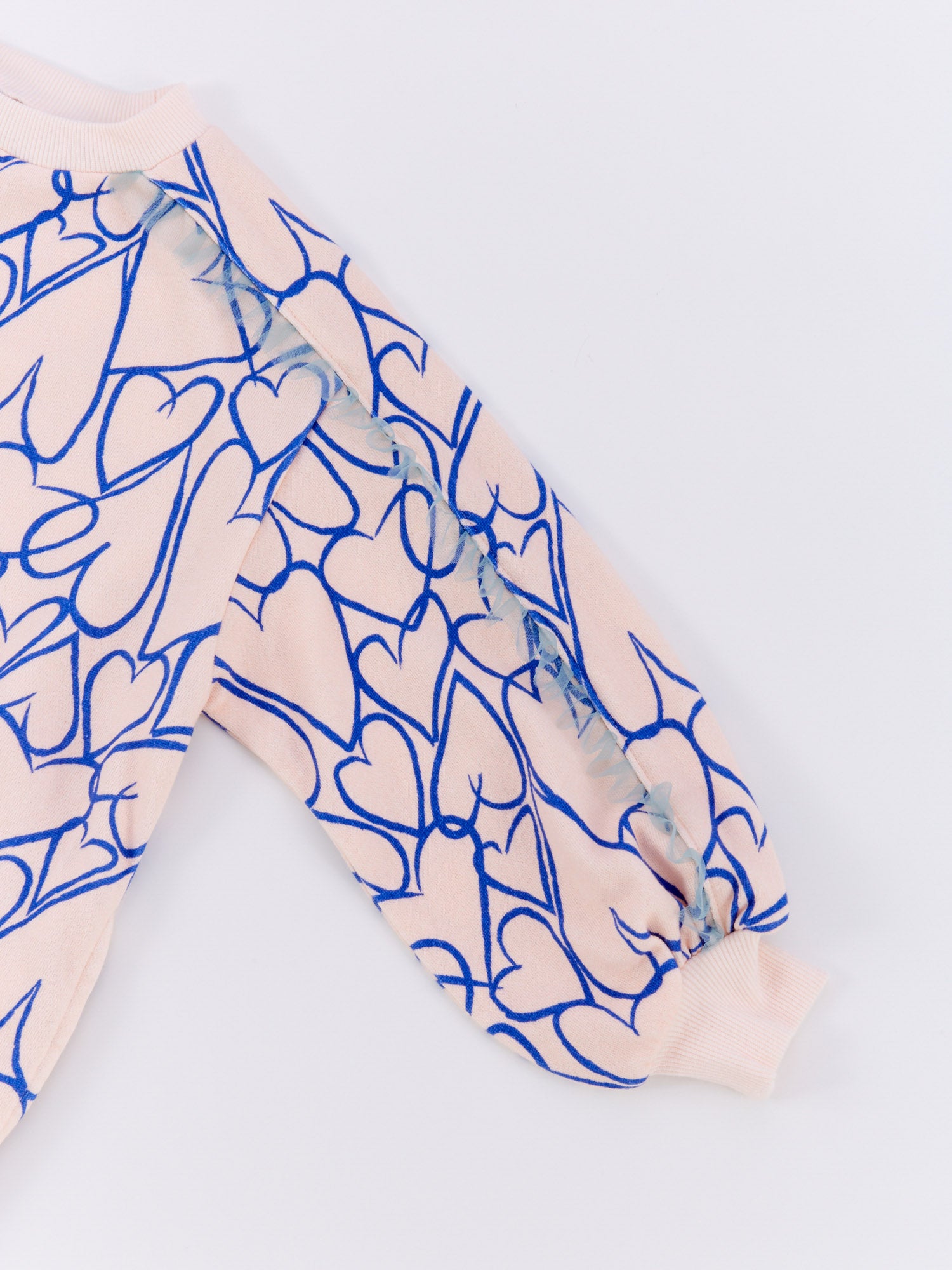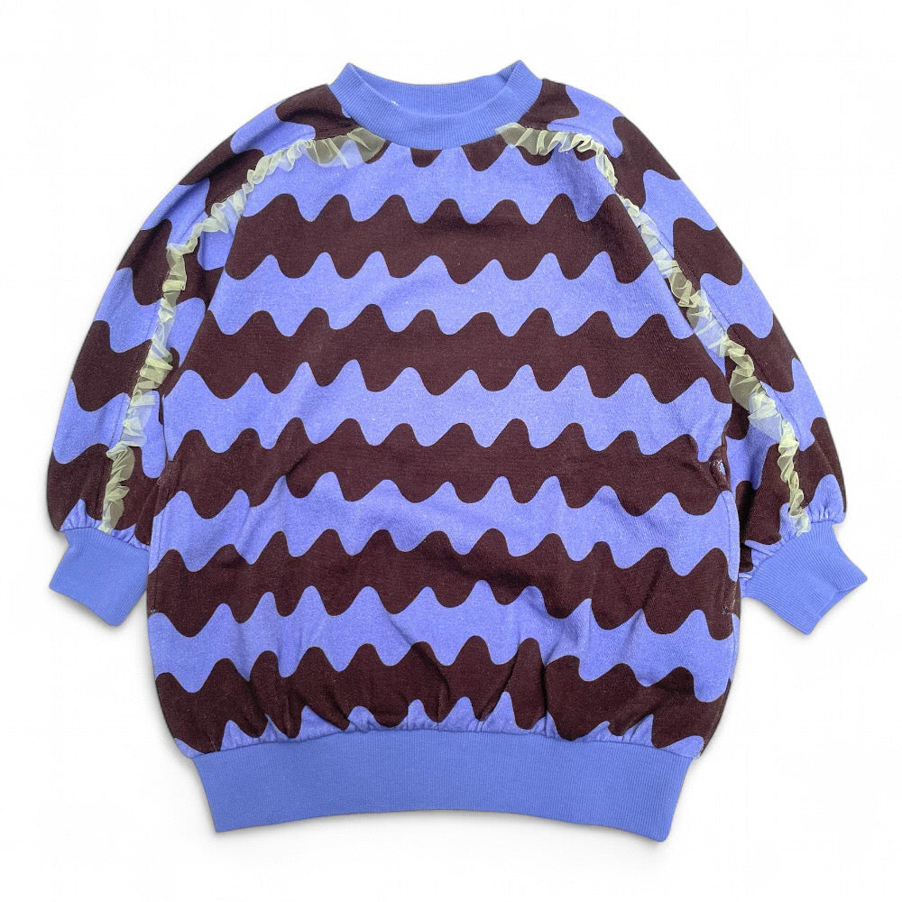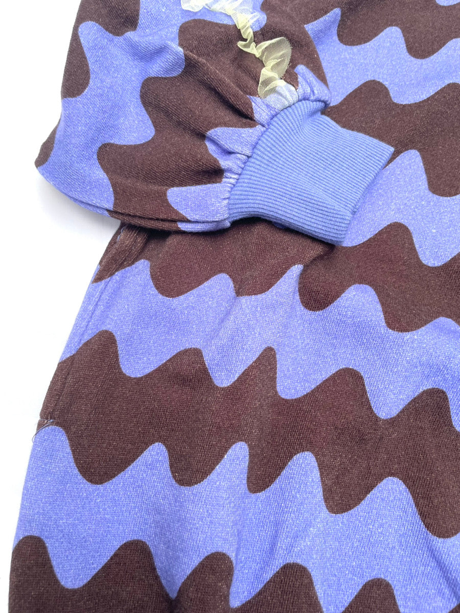 - The ruffled tulle that runs in a line from the neck to the cuffs adds an accent to the design.