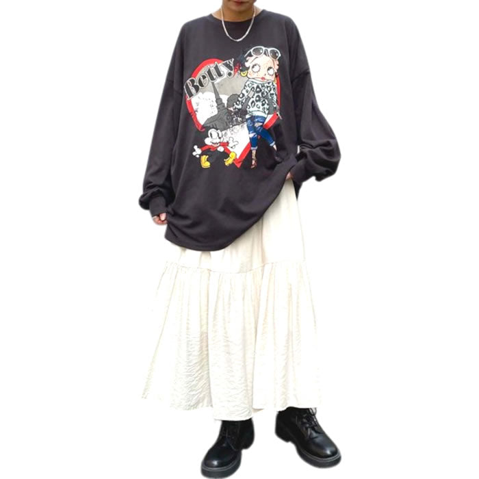 老若男女、幅広い世代から愛されているベティちゃんの新作はフロント、バックにそれぞれインパクトのある絵柄がプリントされたアイテム。POPな魅力溢れるアイテムで今からは一枚で、涼しくなったらインナー使いで着回し力でロングシーズン活躍してくれますよ!