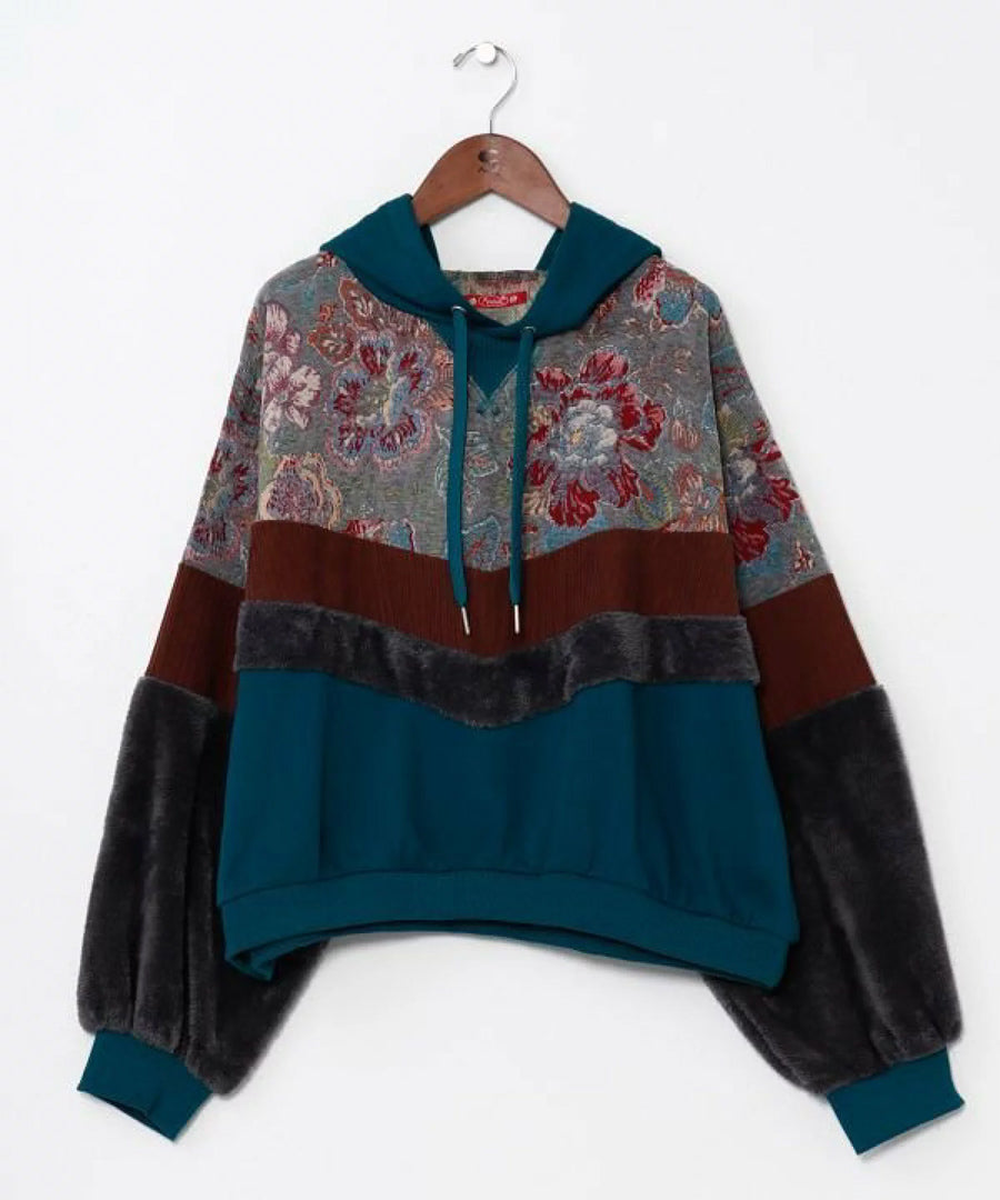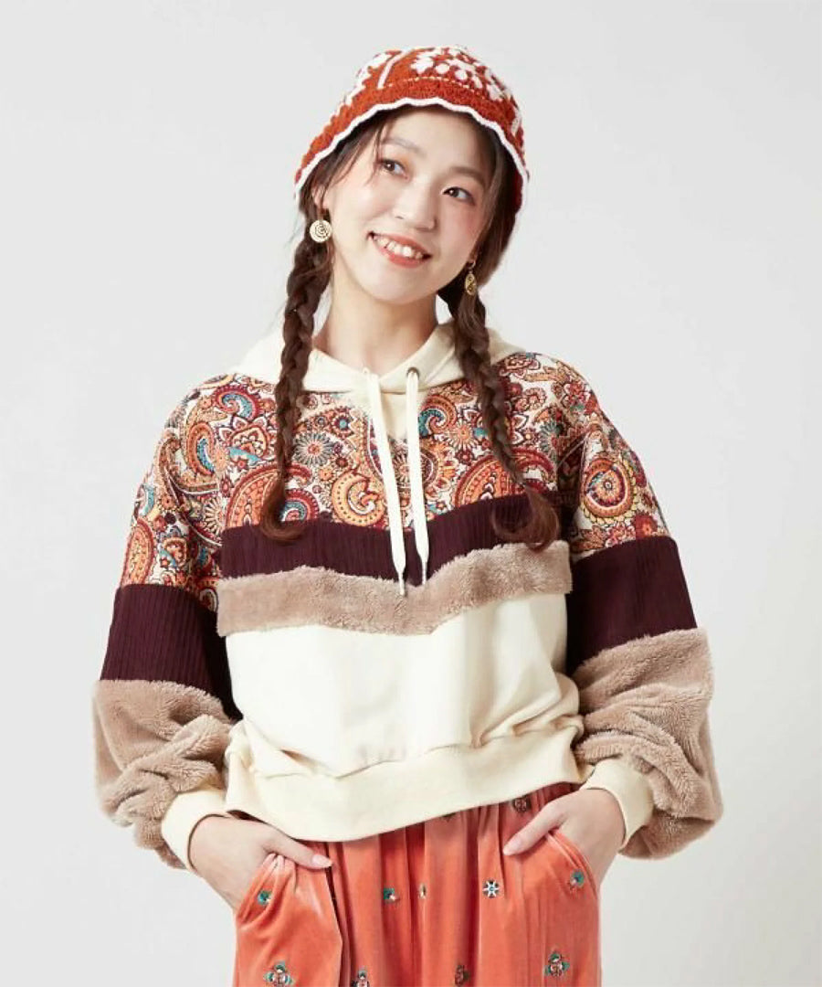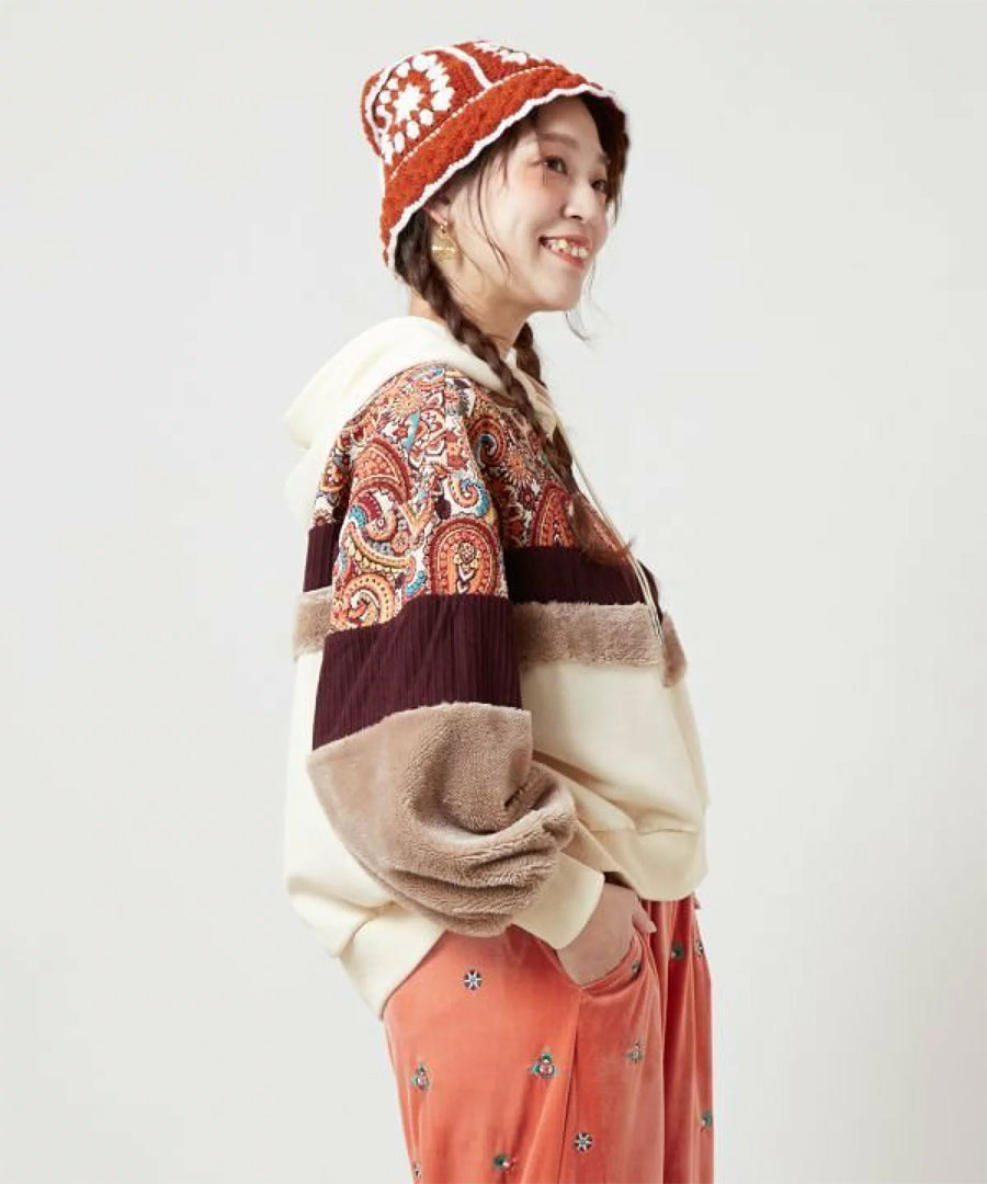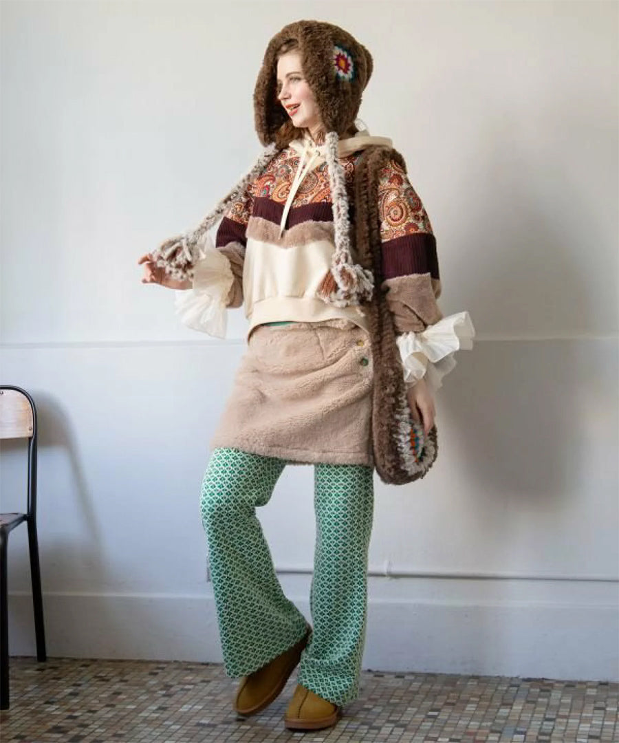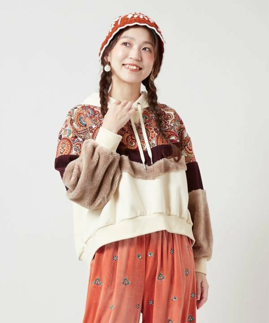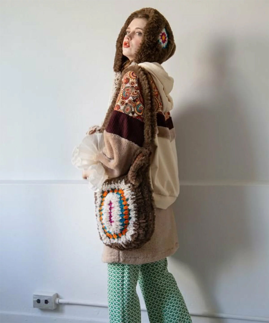 ゴブラン、裏毛、ファー、コーデュロイと4種の異なる生地を贅沢にパッチワークした、