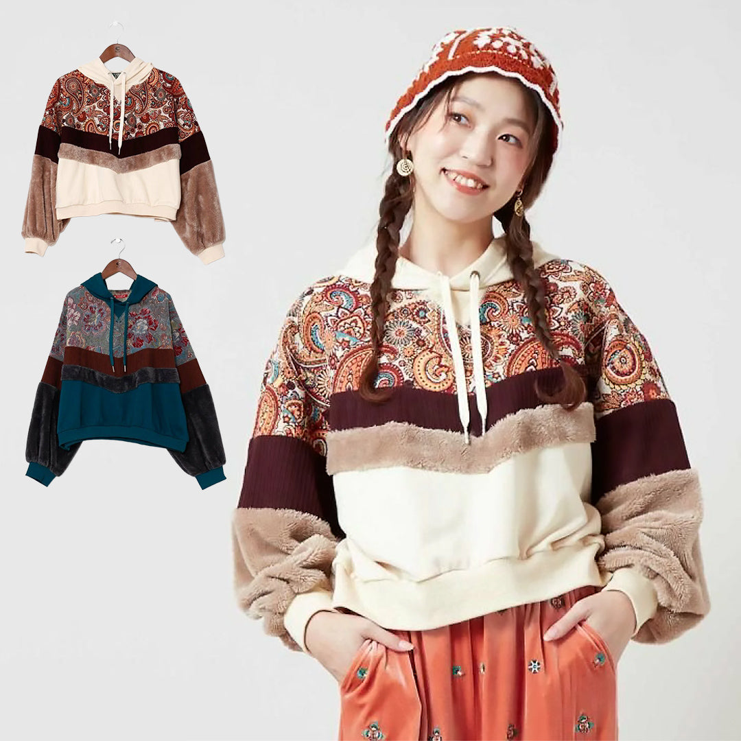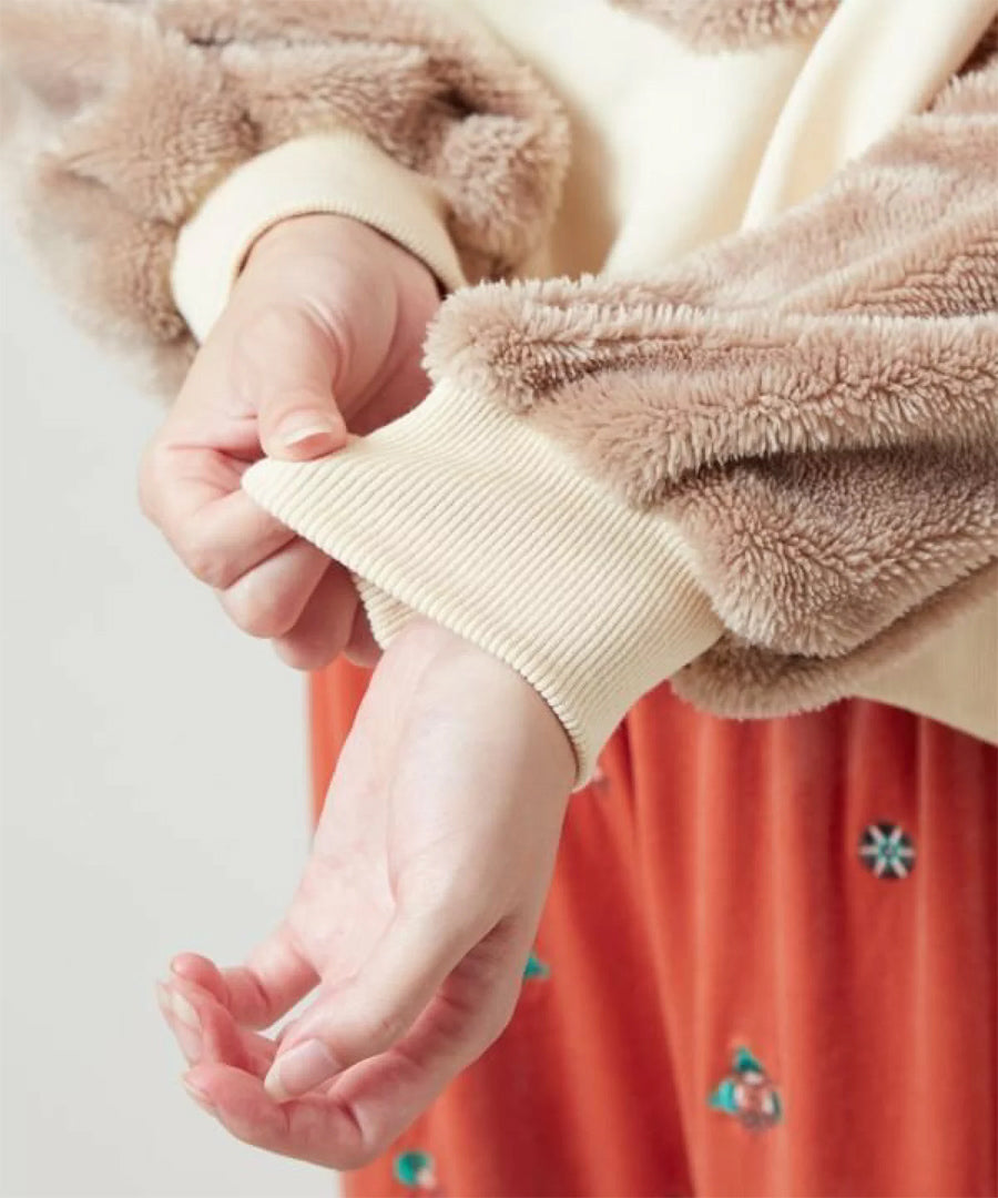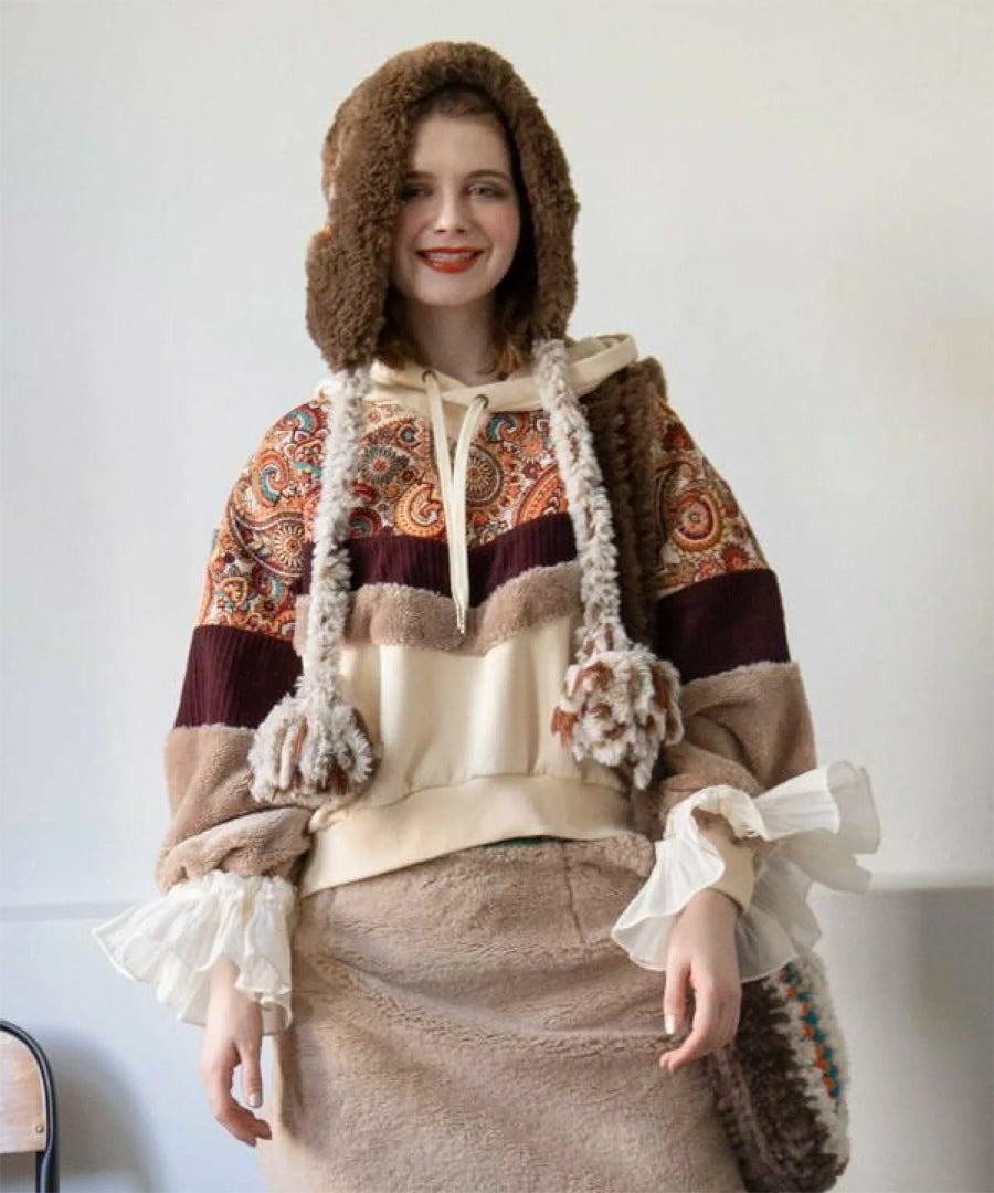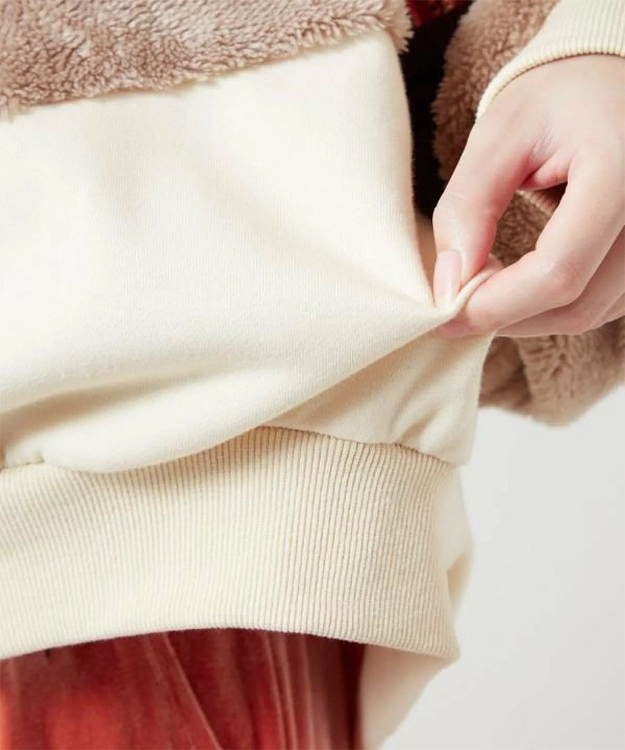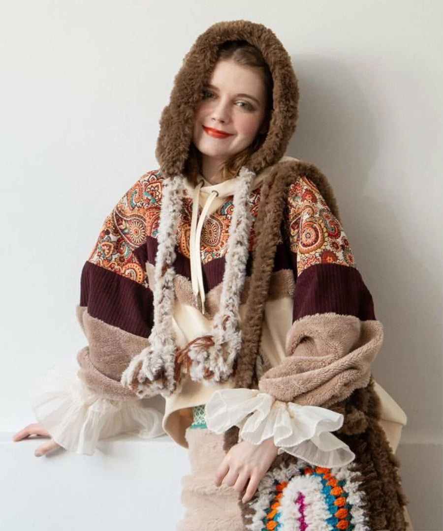 ゴブラン、裏毛、ファー、コーデュロイと4種の異なる生地を贅沢にパッチワークした、