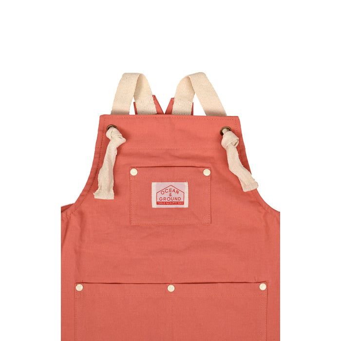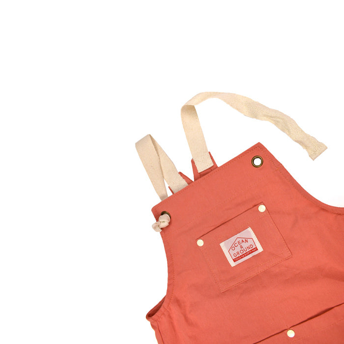 お腹に大きめのポケットが2つついたエプロン、サイズ調整も肩紐で結んで簡単にできます。