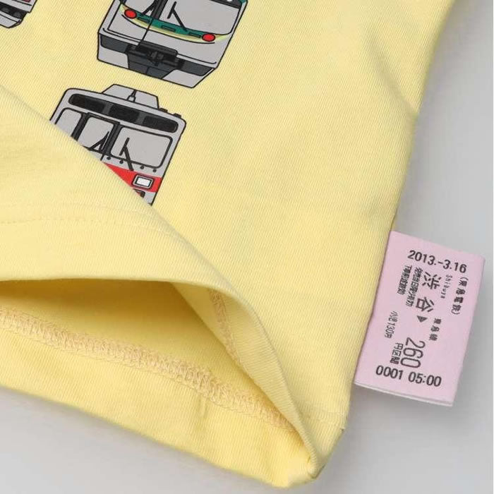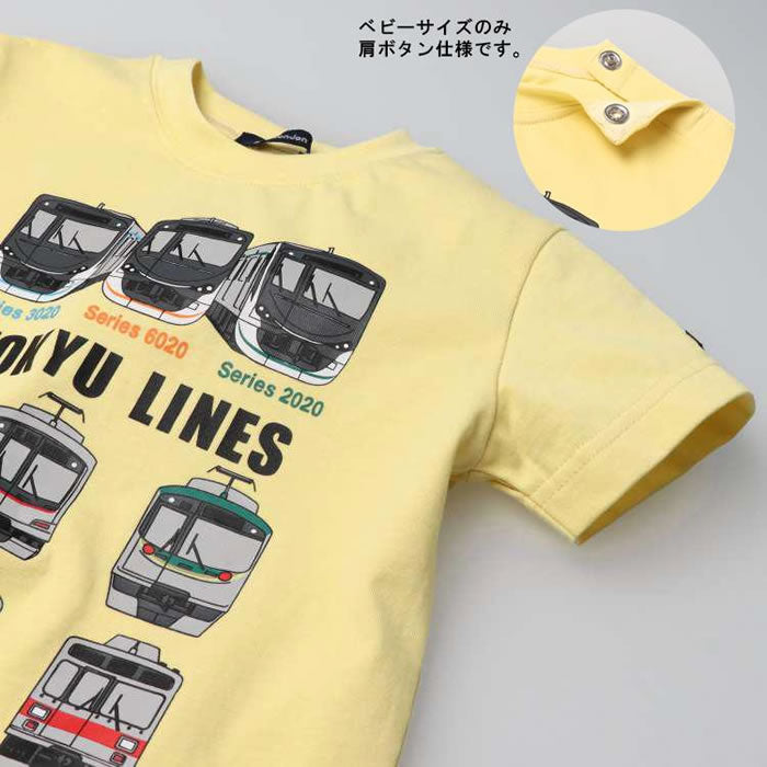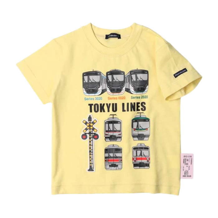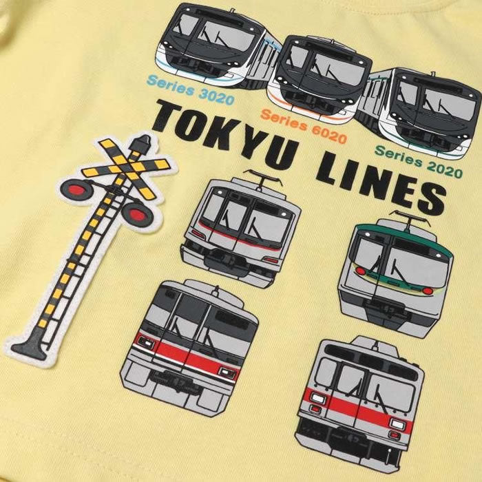 男の子が大好きな電車アイテム! 東急電鉄株式会社商品化許諾済み商品です。 田園都市線の2020系、大井町線の6020系、目黒線の3020系に東横線でも活躍している5000系、目黒線の3000系、池上線東急多摩川線の1000系、7000系などの前から見た車体のプリント入り半袖Tシャツ。 裾の脇部分の切符風のモチーフもポイント! 90cmのみ肩ボタン仕様です。