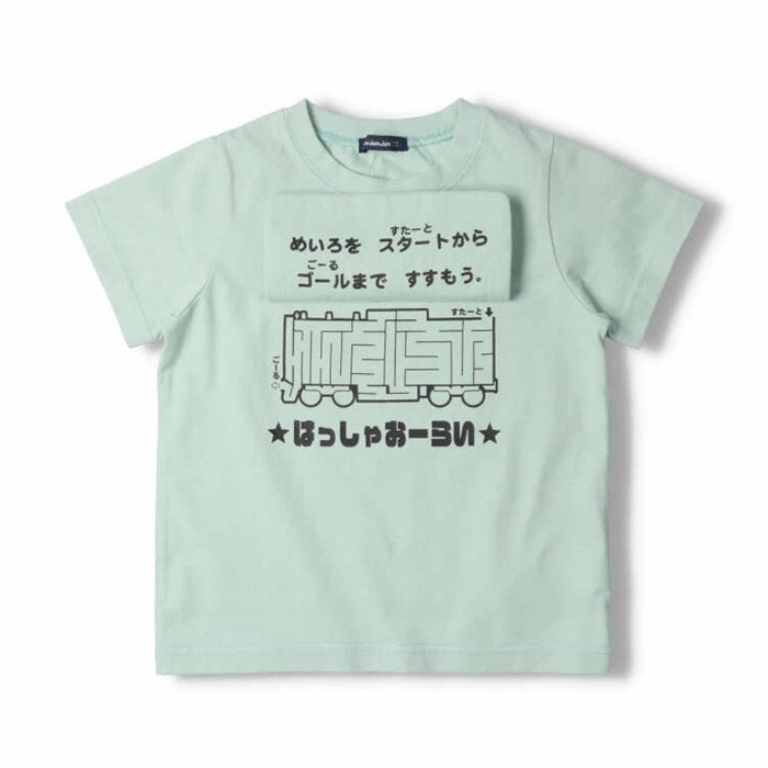 前の電車の車体のプリント部分がフラップになっていて、めくると迷路が出てくる楽しい仕掛け付き。