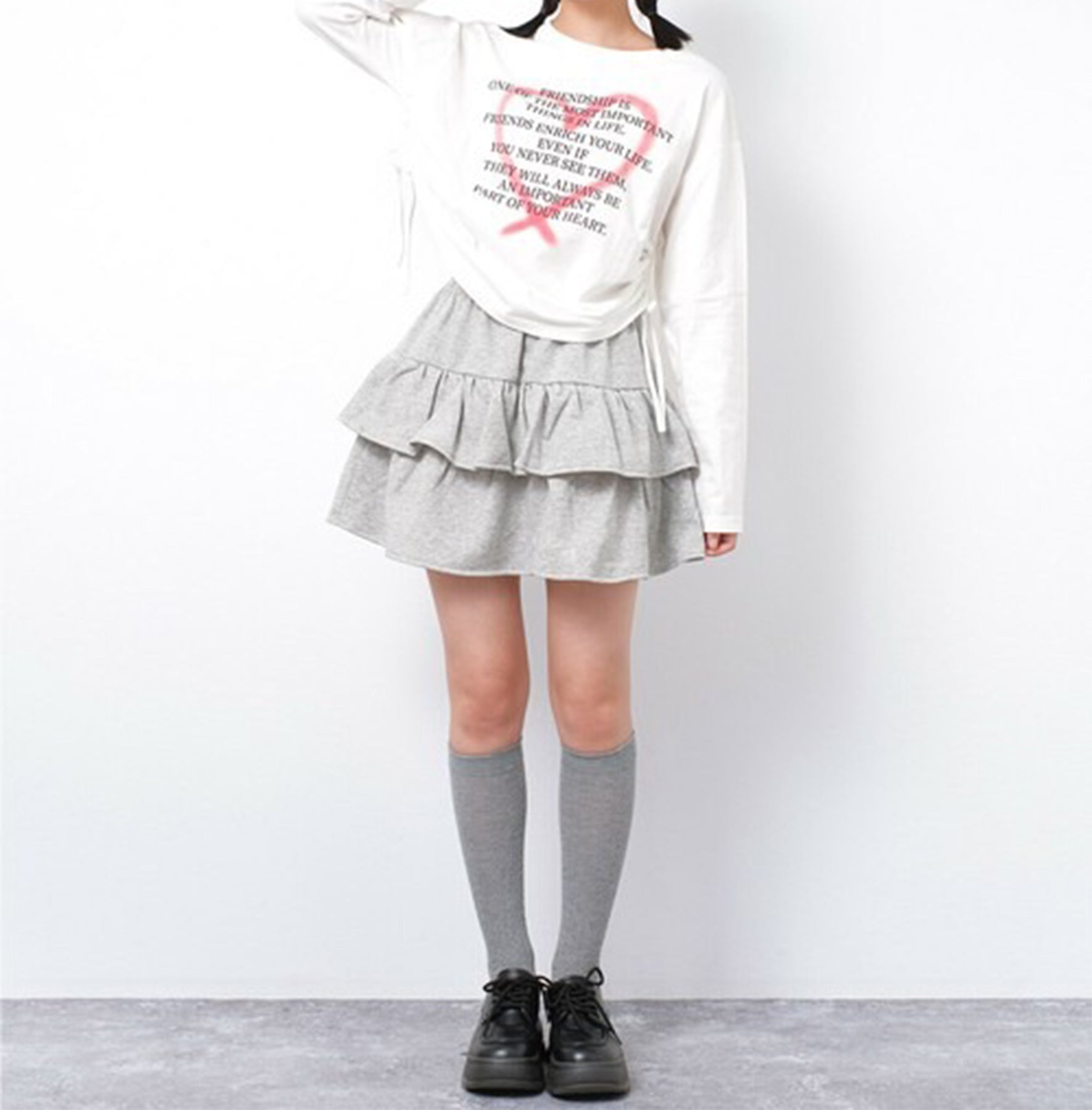英字レタリングプリントに落書きしたようなハートスプレーデザインがかわいいロンTです。 サイドのシャーリング仕様で丈感を調節することでY2Kっぽさも演出。 ワイドパンツでゆるっと着るトレンドライクなスタイルや、ガールズライクにショート丈スカートもおすすめです。 ※生地の透け感:淡色は透け感有り。インナー必須です。