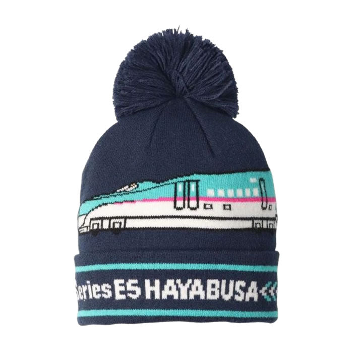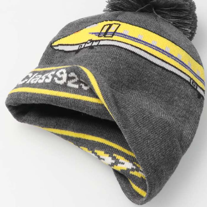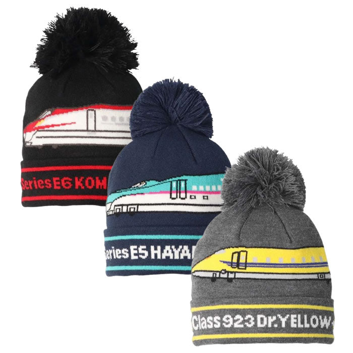 こまち、はやぶさ、ドクターイエローのJRの新幹線柄のアクリル素材のニット帽です。